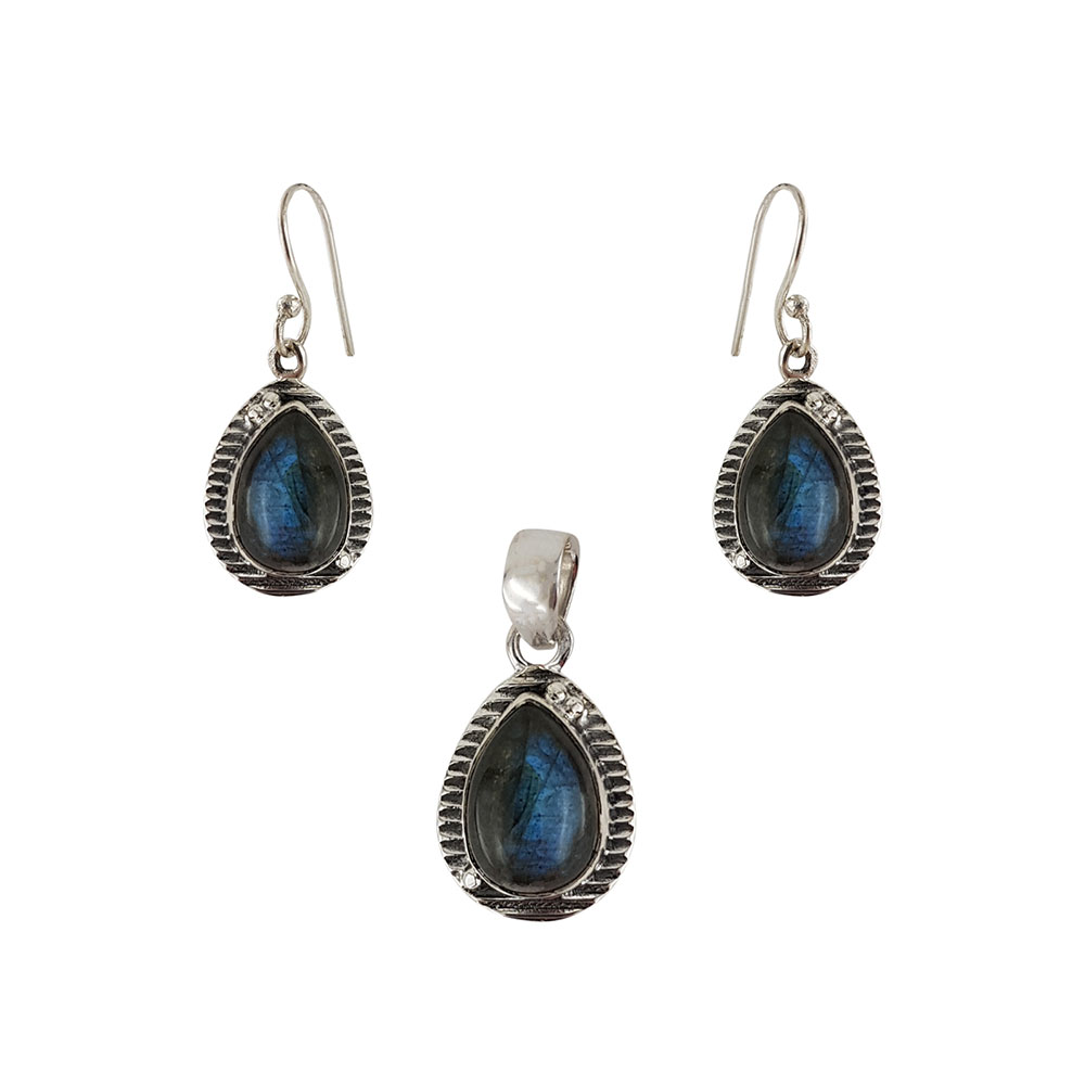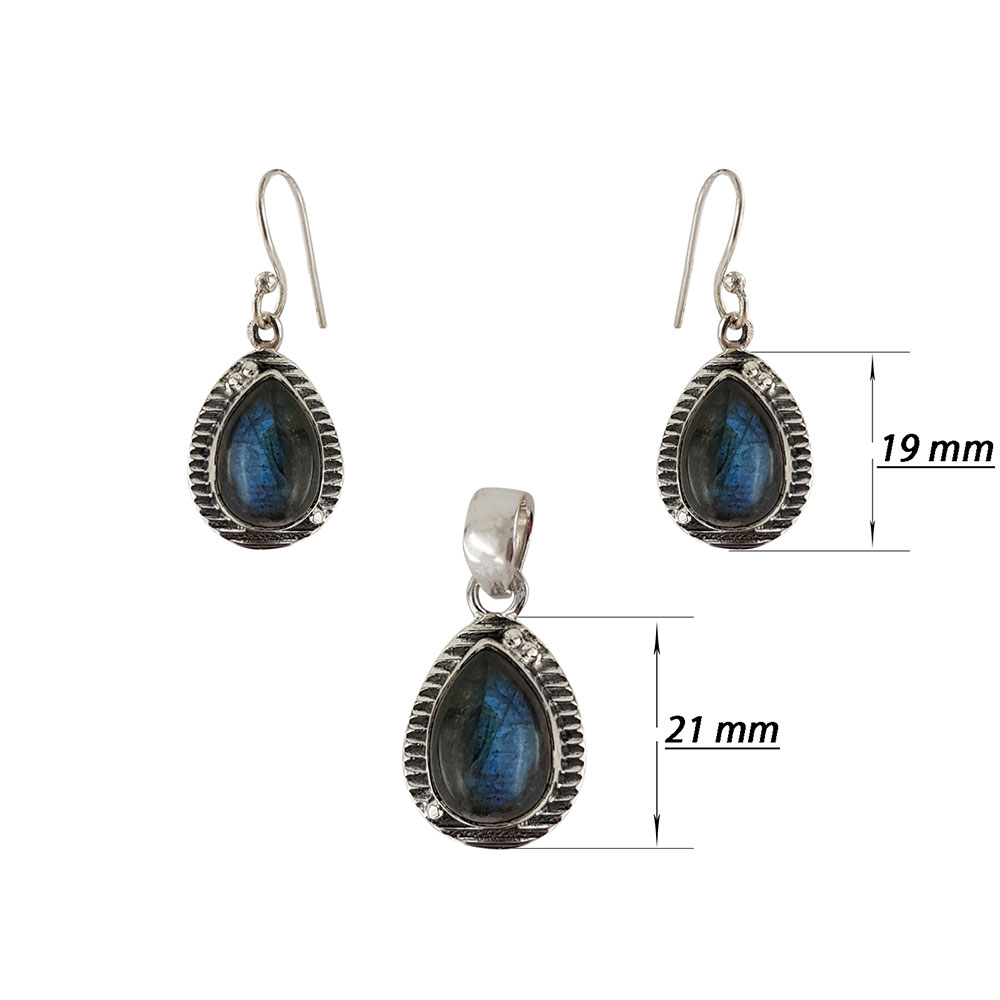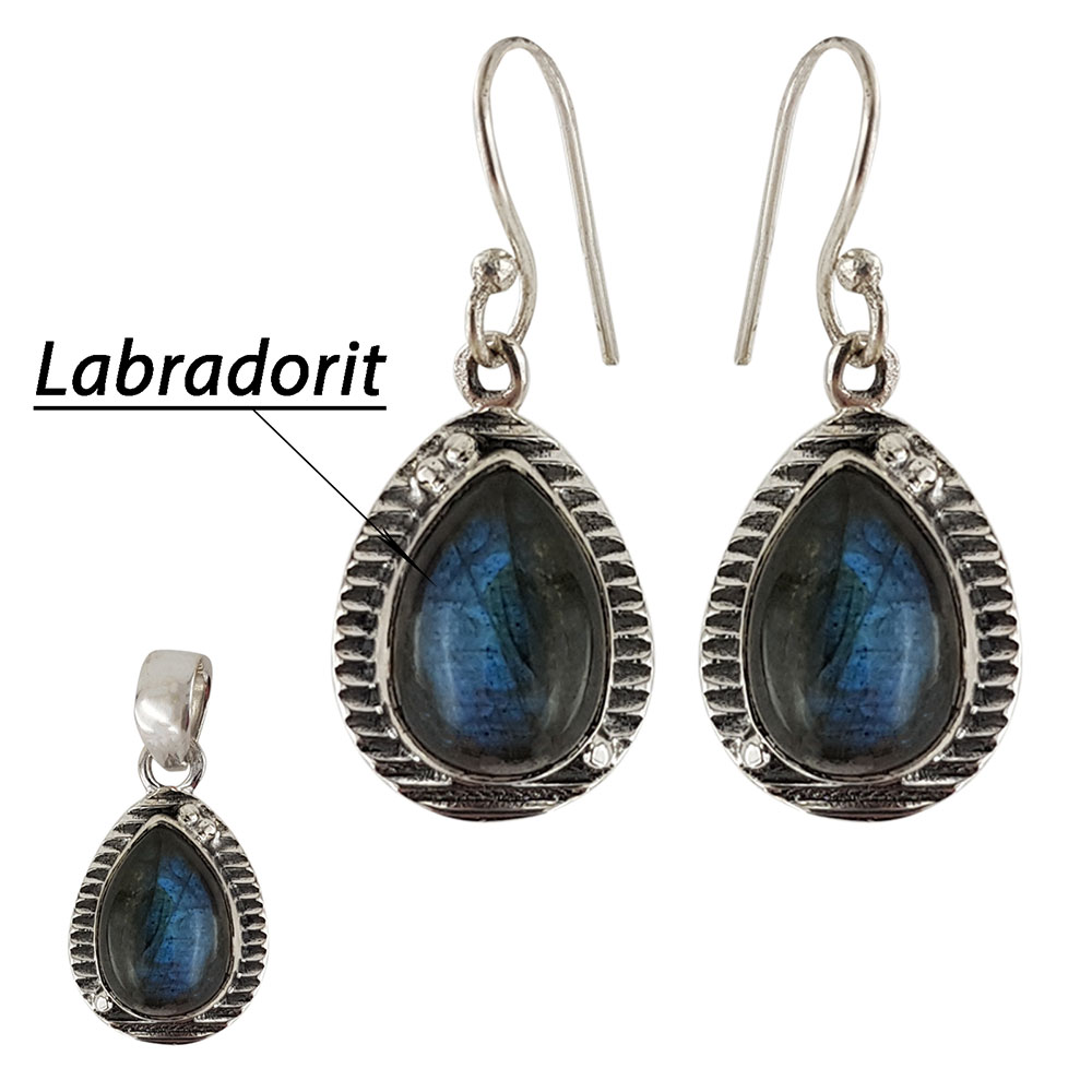 Set din argint 925 usor antichizat, cercei si pandantiv, decorat cu labradorit. Cerceii au tortite agatatoare. Se poate asocia cu inel argint 2011-IPK040I-M2-R-22.