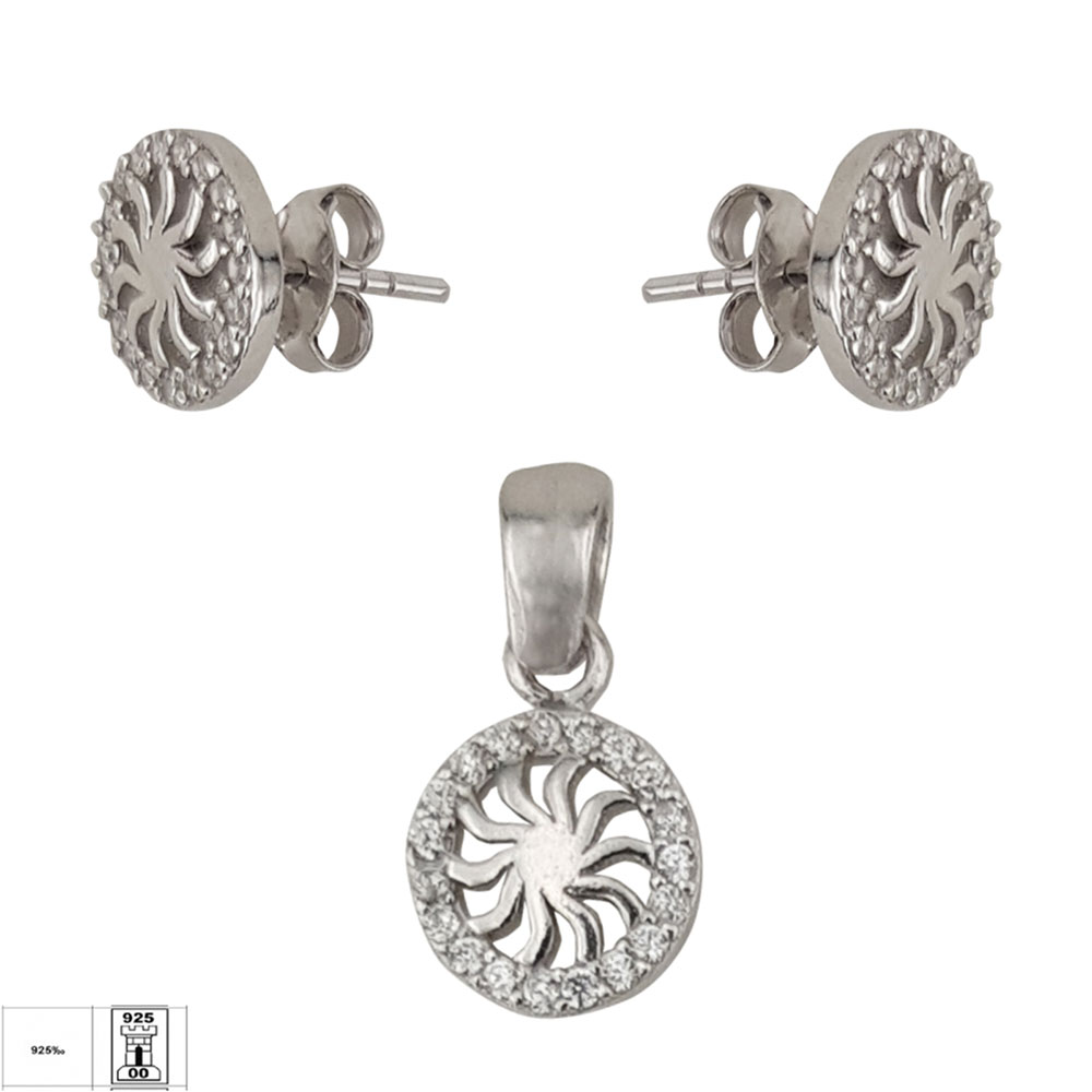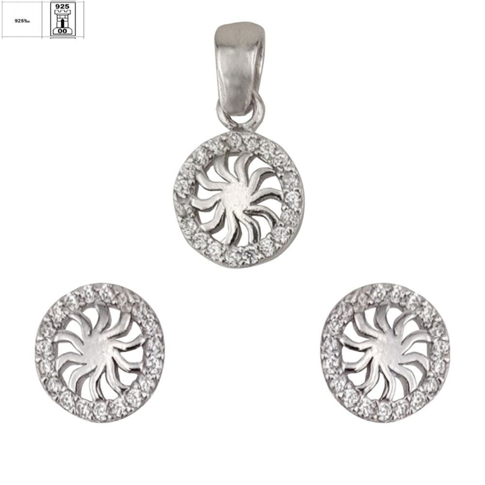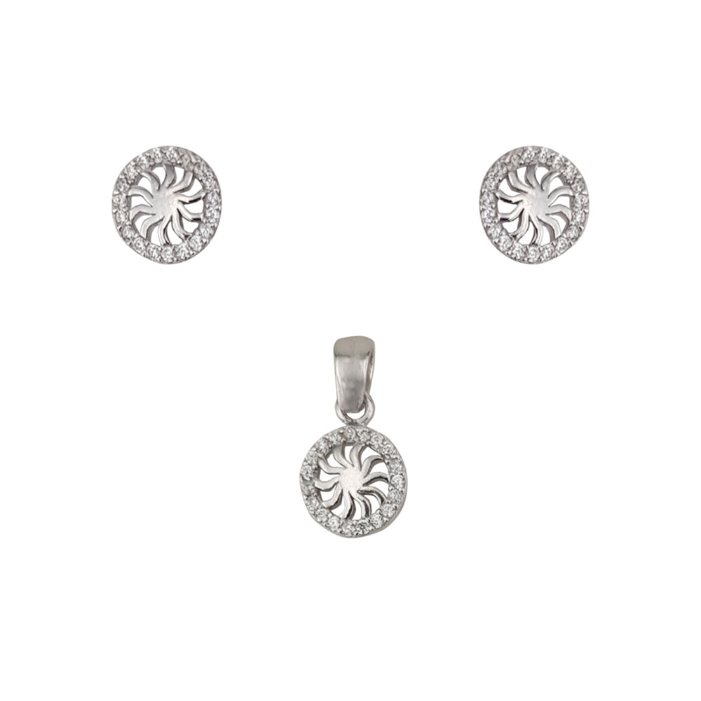 Setul Aris din argint 925 impresioneaza prin designul sau modern si rafinat, ideal pentru femeile care apreciaza eleganta subtila si detaliile fine. Acest set este compus din cercei cu inchidere tip surub si un pandantiv, toate decorate cu un model delicat de morisca, incadrat de un rand de zirconii albe stralucitoare ce adauga un plus de luminozitate si farmec.