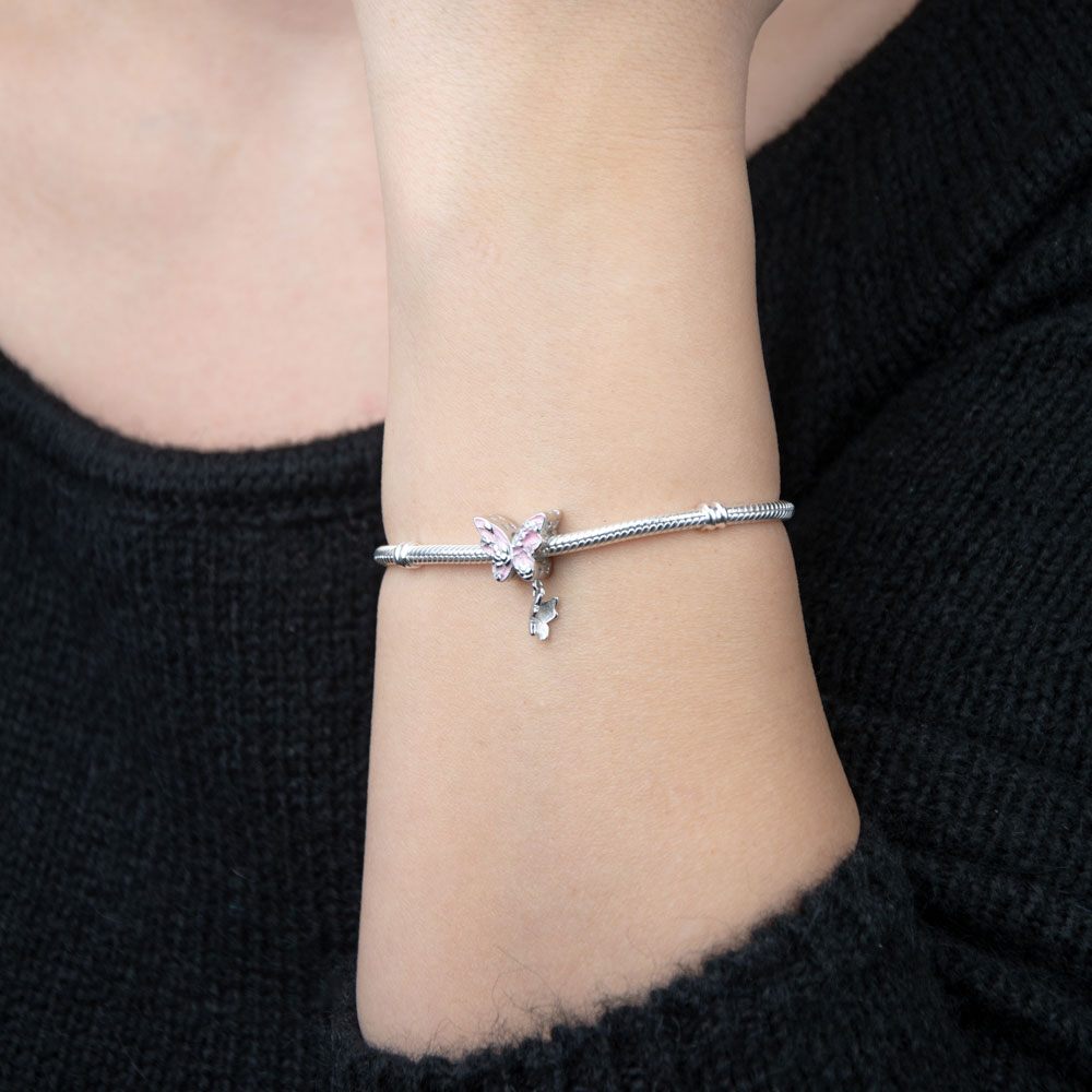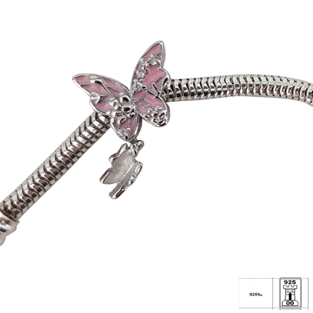 Descopera frumusetea si rafinamentul bijuteriilor noastre prin acest Talisman din argint 925 cu fluturi roz, conceput special pentru a aduce un plus de eleganta si culoare bratarii tale. Fabricat din argint de cea mai inalta calitate, acest talisman este nu doar un accesoriu, ci o veritabila declaratie de stil.