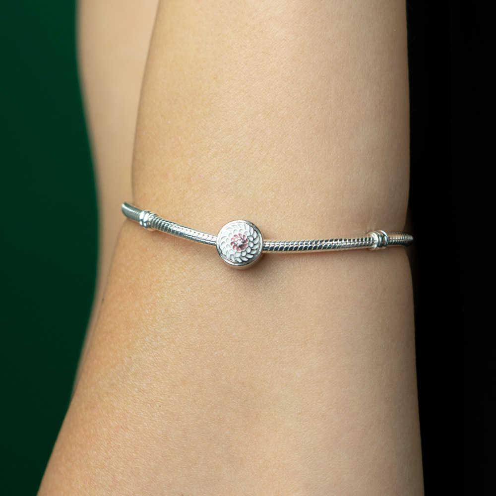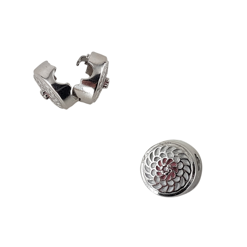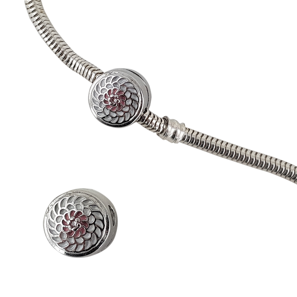 Imbogateste-ti colectia de bijuterii cu acest talisman opritor din argint 925, decorat cu email in nuante delicate de alb si roz. Acest accesoriu este nu doar un adaugat frumos, ci si un element functional pentru bratara ta de charm-uri.