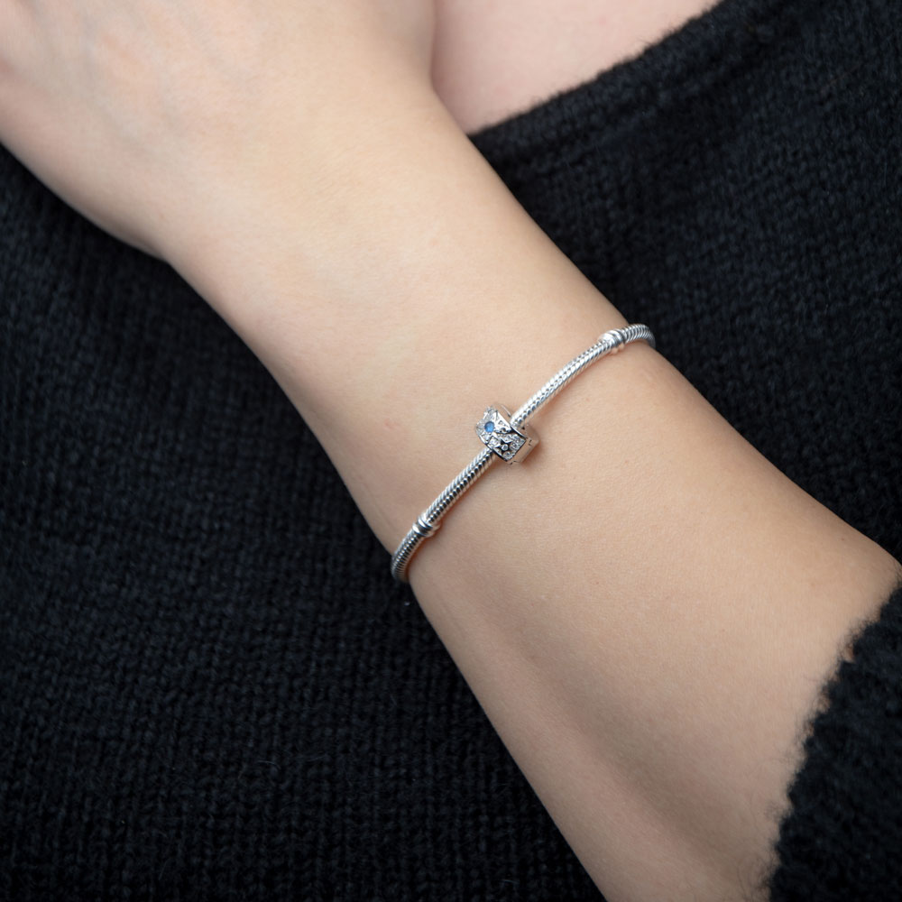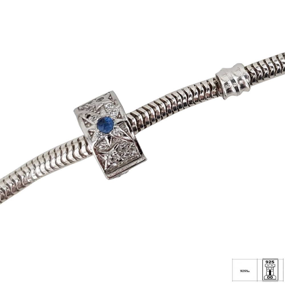 Explorati colectia noastra de talismane din argint 925, perfecte pentru a adauga o nota personala si sofisticata oricarei bratari. Acest talisman opritor cu zirconiu albastru este o alegere ideala pentru cei care cauta sa imbine estetica cu functionalitatea.