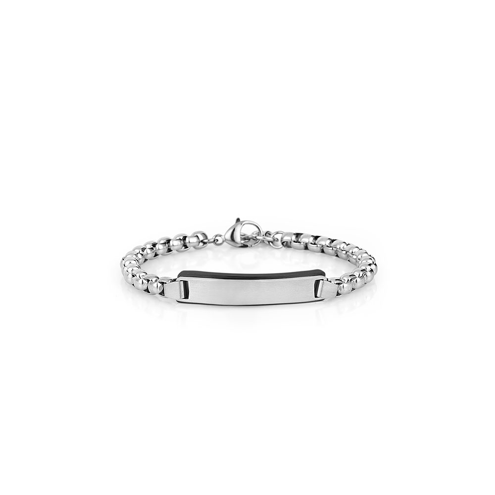 Designul bratarii este definit de o placuta centrala cu finisaj mat, accentuata de insertii negre subtile, care adauga un contrast sofisticat. Lantul este compus din elemente metalice rotunjite, conferind un aspect modern si o purtare confortabila.