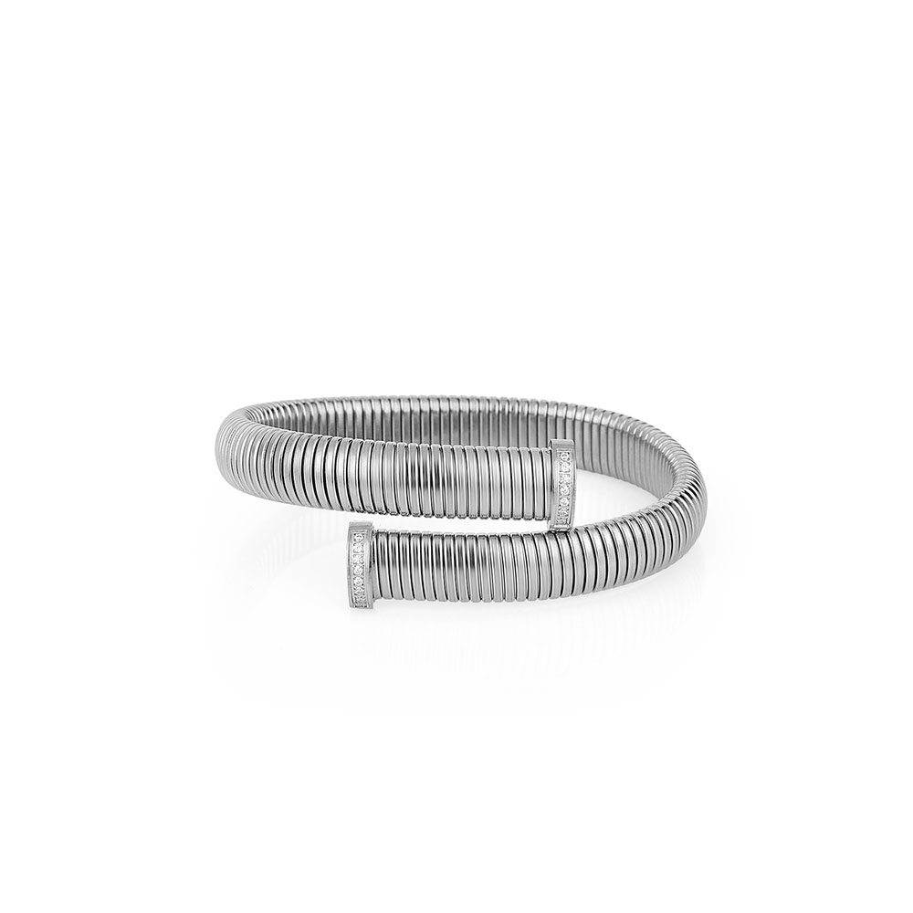 Designul sau flexibil, cu o textura tip spirala, se muleaza perfect pe incheietura, oferind un confort deosebit la purtare. Capetele bratarii sunt decorate cu zirconii stralucitoare, adaugand un plus de eleganta si un efect vizual captivant.