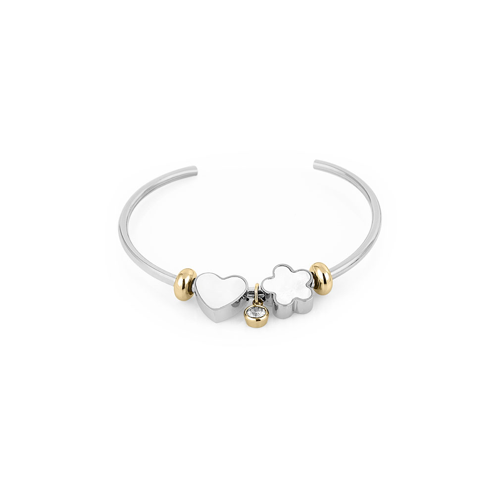 Bratara are o structura deschisa, ceea ce o face usor de purtat si ajustat. Decorata cu elemente sidefate in forma de inima si trifoi, aceasta simbolizeaza iubirea si norocul, adaugand un farmec aparte oricarei aparitii. Accentele aurii ofera un contrast elegant, evidentiind detaliile sofisticate ale designului.