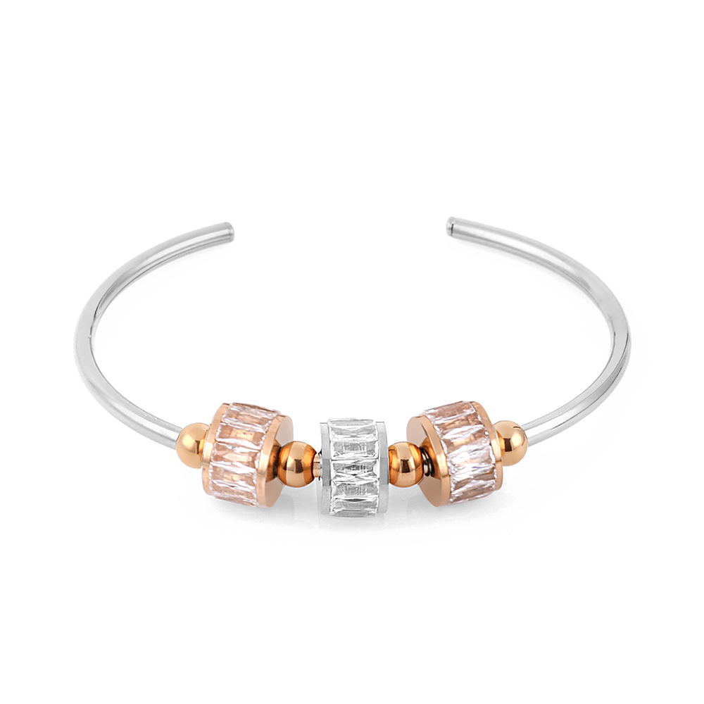Realizata din otel inoxidabil, bratara este rezistenta la uzura si pastreaza stralucirea timp indelungat. Elementele decorative cu zirconii confera un efect sofisticat, iar combinatia de argintiu si auriu rose ofera un contrast elegant si versatil.