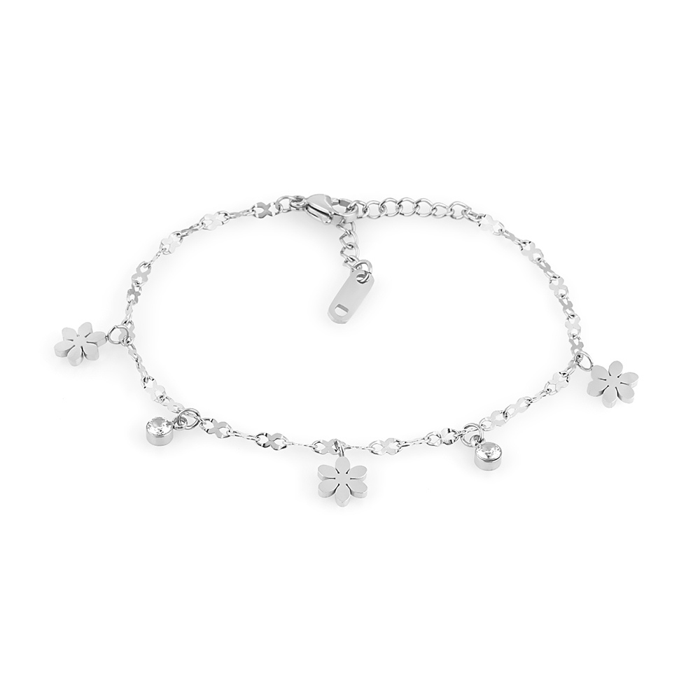 Bratara este compusa dintr-un lant subtire, decorat cu pandantive in forma de floare si zirconii stralucitoare, adaugand un plus de eleganta si feminitate. Cu o lungime de 160 mm si o latime de 2 mm, aceasta se aseaza confortabil pe incheietura, iar sistemul de inchidere tip carlig asigura o fixare sigura si usoara.