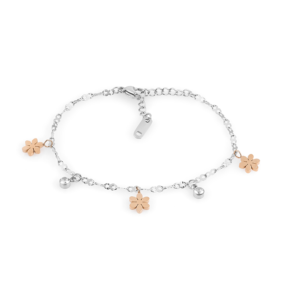 Designul acestei bratari este imbogatit de charm-uri sub forma de flori aurii rose, care adauga un aer feminin si delicat. De asemenea, zirconiile stralucitoare inserate pe lant confera un plus de eleganta si rafinament, captand lumina in mod spectaculos.