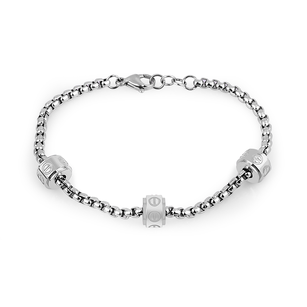 Bratara dispune de un lant fin, decorat cu trei margele cilindrice cu detalii gravate, care adauga un plus de rafinament si unicitate. Sistemul de inchidere tip lobster asigura o fixare sigura si confortabila, permitand purtarea bratarii pe tot parcursul zilei.