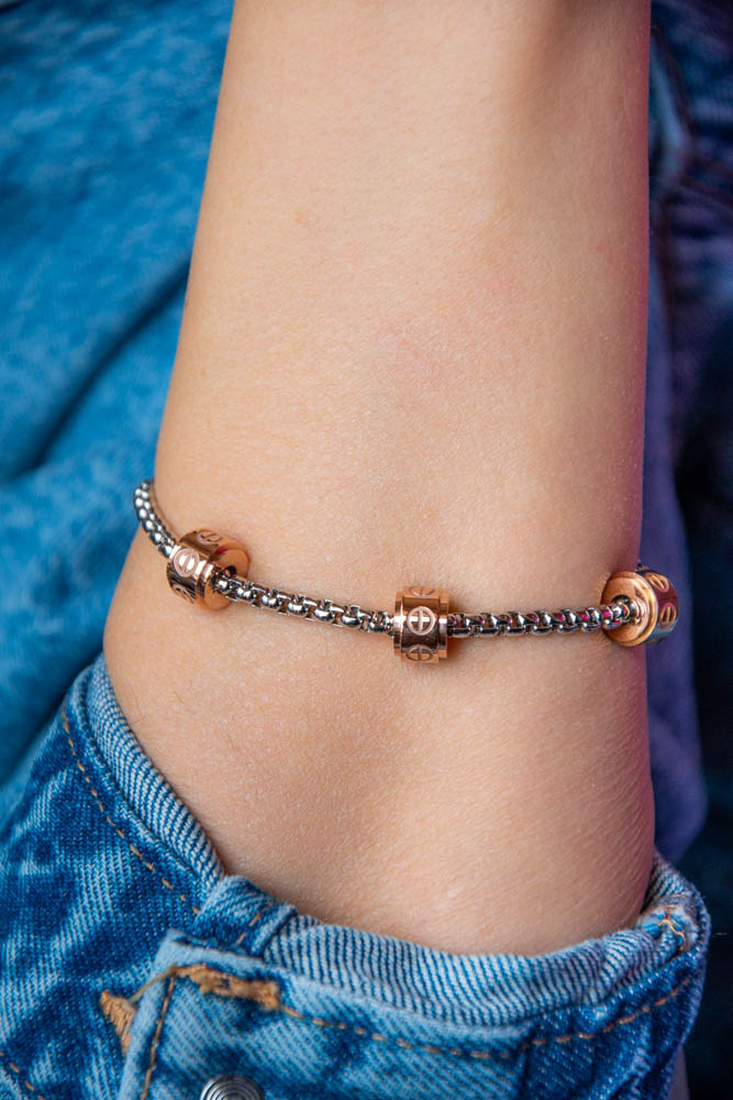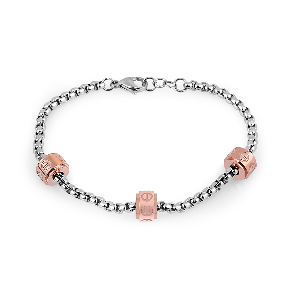 Bratara este confectionata dintr-un lant argintiu cu zale fine si este decorata cu trei elemente cilindrice aurii roz, fiecare avand un finisaj atent lucrat pentru un efect vizual impresionant. Aceste detalii confera bijuteriei un aspect sofisticat si o versatilitate remarcabila, fiind potrivita atat pentru tinutele casual, cat si pentru cele elegante.