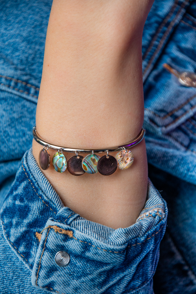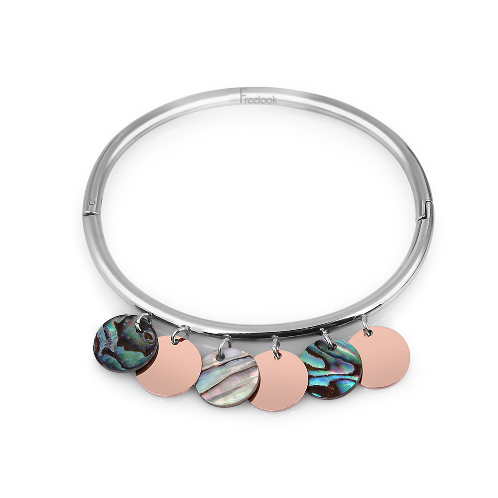 Bratara este decorata cu elemente Abalone, care adauga un joc fascinant de culori si reflexii unice, completate de discuri metalice in nuante de aur roz. Aceasta combinatie de materiale si tonuri creeaza un efect vizual deosebit, potrivit atat pentru tinute casual, cat si pentru ocazii speciale.