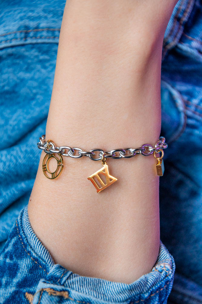 Bratara este compusa din zale argintii robuste, completate armonios de charm-uri aurii cu design inspirat de cifre romane. Aceste detalii unice confera un aer clasic, dar in acelasi timp contemporan, facand din acest accesoriu o alegere versatila pentru orice ocazie.