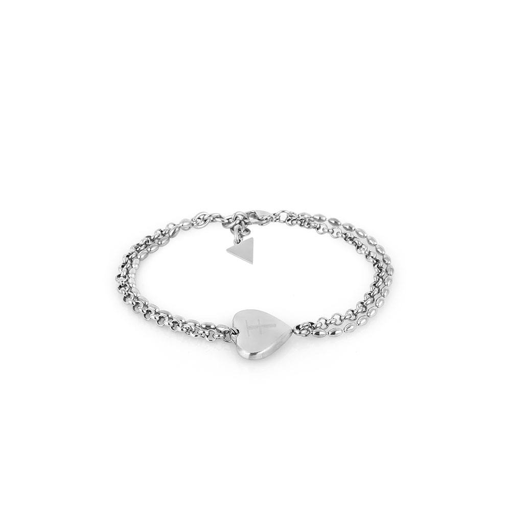 Elementul central al bratarii este un pandantiv in forma de inima, cu finisaj lucios si gravura subtila, adaugand o nota romantica si feminina. Inchiderea de tip carlig asigura o fixare sigura si confortabila pe incheietura.
