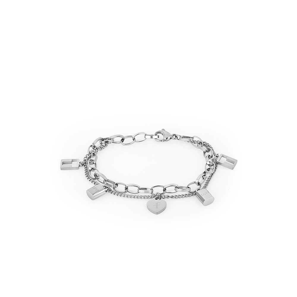 Adauga un plus de rafinament tinutelor tale cu aceasta bratara argintie Freelook, realizata din otel inoxidabil de inalta calitate. Designul elegant si modern al bratarii este completat de un lant dublu, decorat cu talismane minimaliste care adauga un aer sofisticat oricarei aparitii.