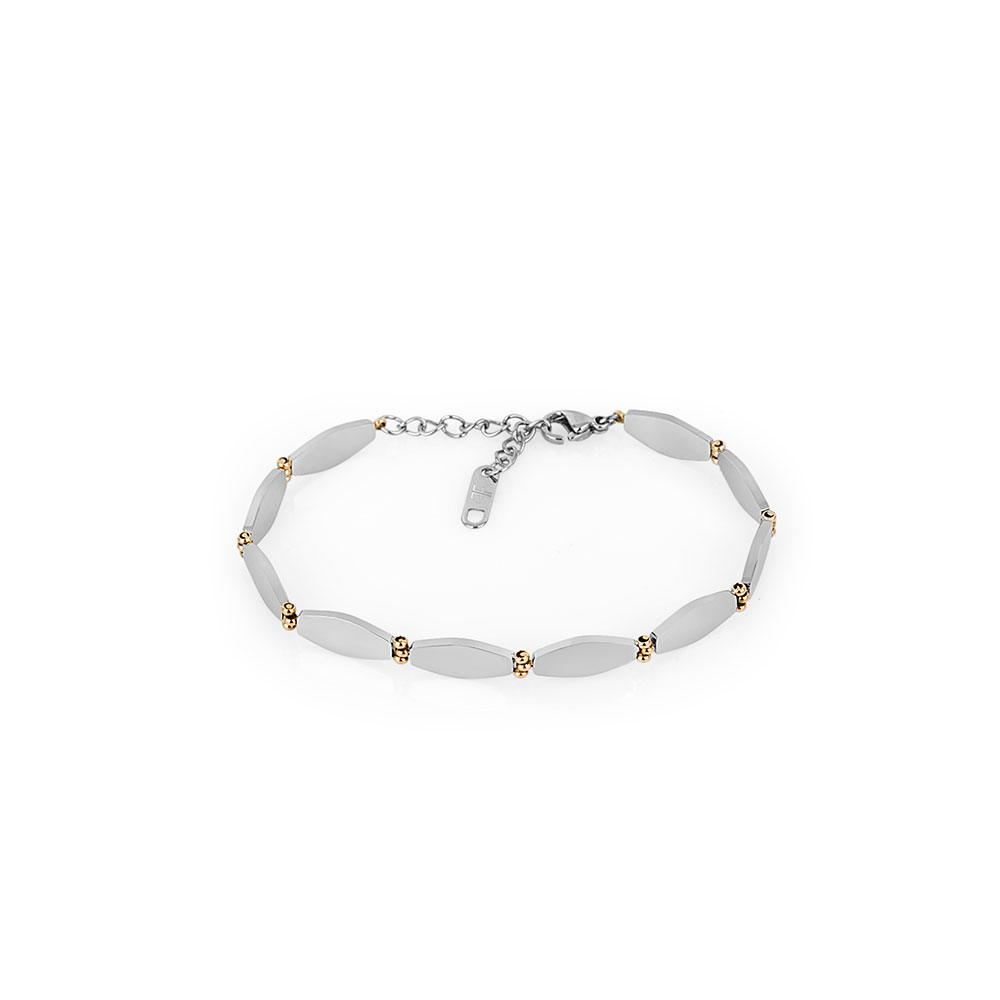 Bratara este compusa din elemente argintii cu forme alungite, legate prin detalii fine aurii, care adauga un contrast subtil si elegant. Acest mix de culori confera accesoriului un aspect distinctiv si versatil, usor de asortat atat la tinute casual, cat si la outfituri elegante.