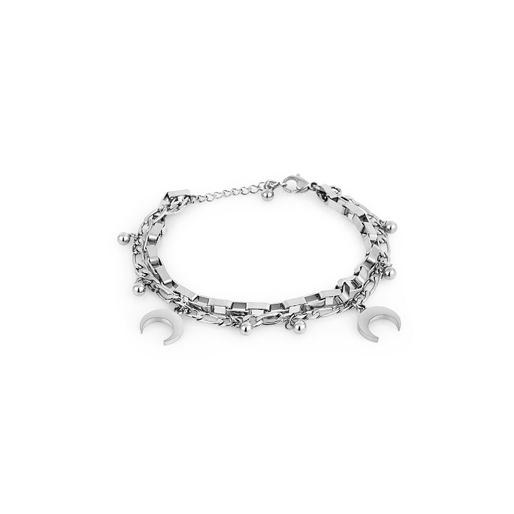 Designul sau complex include mai multe lantisoare impletite armonios, decorate cu margele metalice si pandantive in forma de semiluna, oferind un aspect delicat si feminin. Finisajul argintiu adauga un plus de stralucire, fiind usor de asortat atat cu tinutele casual, cat si cu cele elegante.
