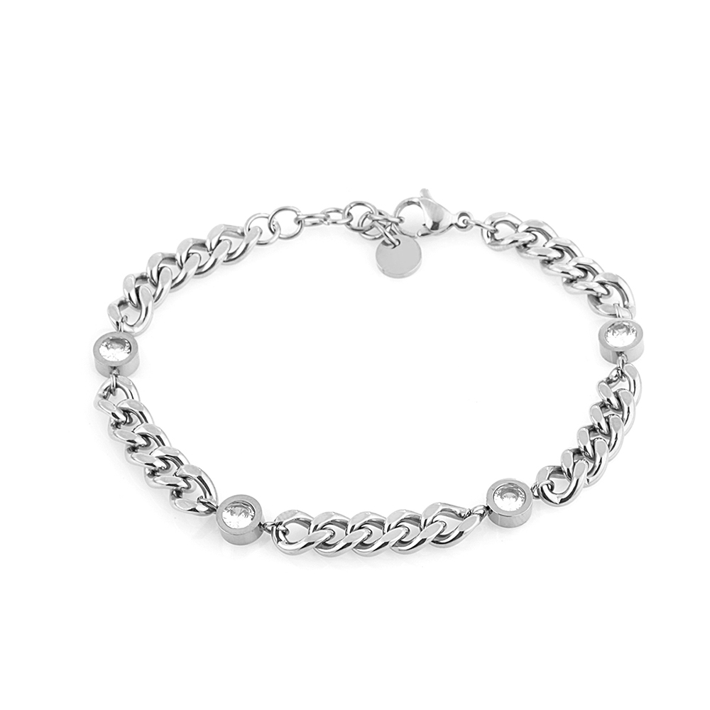 Fabricata din otel inoxidabil, bratara este rezistenta la uzura si isi pastreaza stralucirea timp indelungat. Elementele decorative includ zirconii stralucitoare, amplasate simetric pe lantul impletit, oferind un efect vizual deosebit.