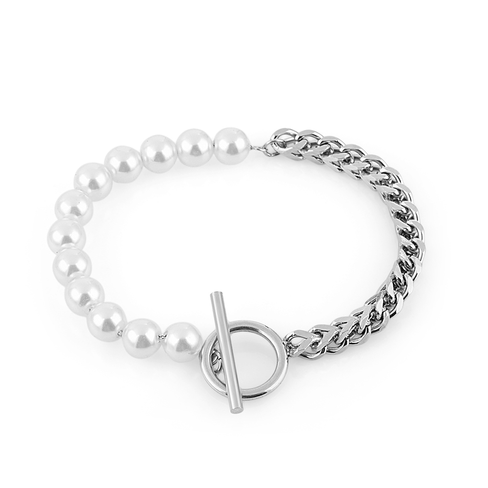 Designul sau distinctiv combina doua stiluri elegante: un lant robust cu zale fine si un sir de margele din sidef, oferind un echilibru perfect intre modern si clasic. Inchiderea cu sistem tip carlig asigura o fixare sigura si confortabila pe incheietura.