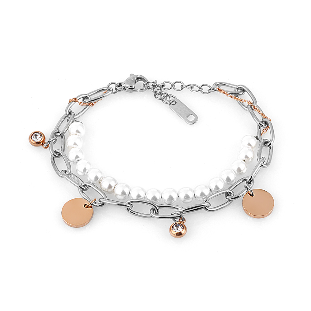Fabricata din otel inoxidabil de inalta calitate, bratara este rezistenta la uzura si isi pastreaza stralucirea in timp. Culoarea argintie este completata armonios de detaliile aurii rose, oferindu-i un aspect sofisticat si versatil. Elementele decorative din sidef adauga un plus de eleganta si rafinament, transformand acest accesoriu intr-o piesa deosebita.