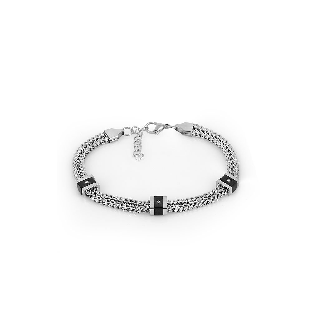 Bratara este realizata din otel inoxidabil argintiu, un material durabil si rezistent la coroziune, asigurand o purtare confortabila pe termen lung. Elementele decorative in nuanta negru, accentuate de zirconii stralucitoare, adauga un plus de rafinament si exclusivitate.