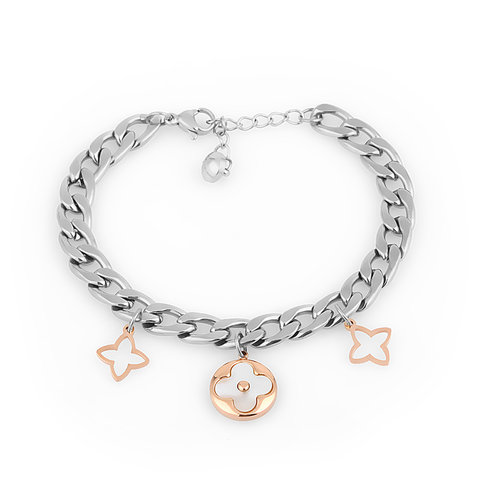 Bratara are un lant argintiu robust, cu zale late, oferind un aspect impunator, dar rafinat. Decoratiunile sale distincte, in nuante de auriu rose si sidef, adauga un plus de feminitate si stralucire. Cele trei pandantive in forma de floare creeaza un efect vizual armonios, transformand acest accesoriu intr-o piesa statement.