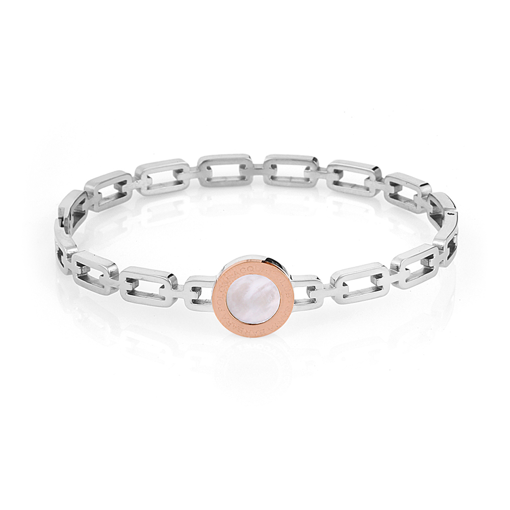 Designul modern al bratarii este accentuat de un element central decorat cu sidef, incadrat de un contur in nuanta auriu rose, adaugand un contrast subtil si elegant. Lantul bratarii are un aspect minimalist, format din zale geometrice, oferind un echilibru perfect intre robustete si delicatete.