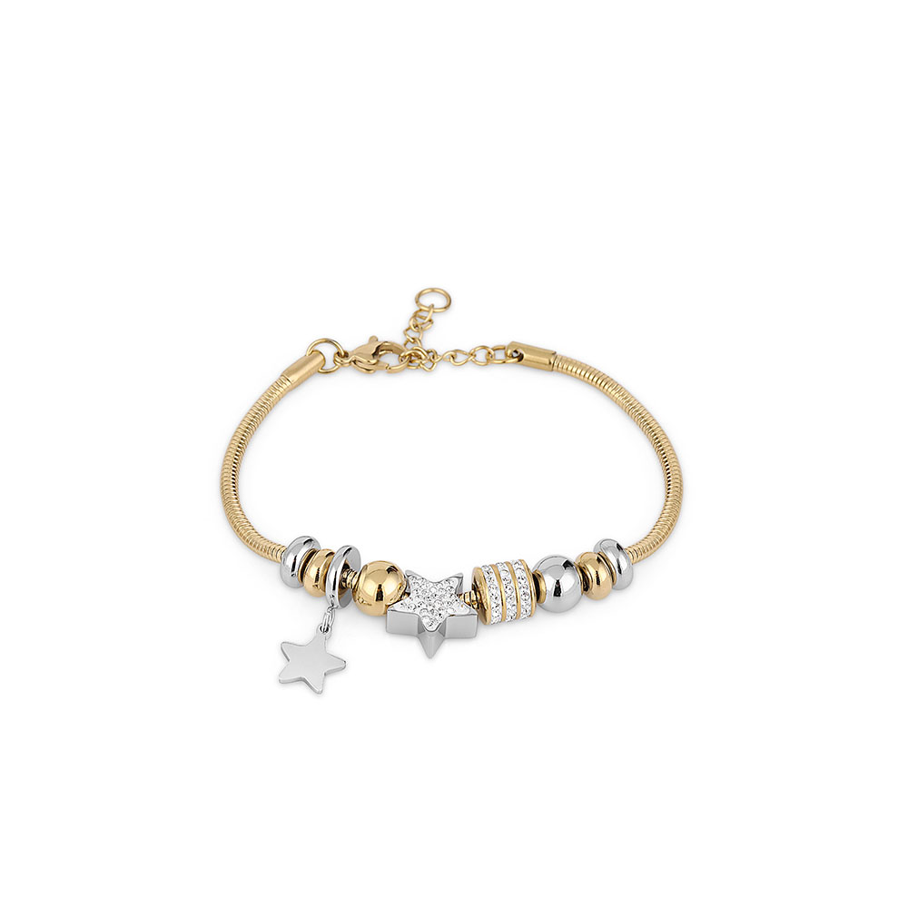 Bratara este decorata cu zirconii stralucitoare, adaugand un plus de eleganta si rafinament. Elementele sale decorative includ margele metalice bicolore si pandantive in forma de stea, oferind un aspect modern si versatil. Cu o lungime de 200 mm si o latime de 12 mm, aceasta bratara se potriveste perfect pe incheietura, iar sistemul de inchidere tip carlig asigura o fixare sigura si confortabila.