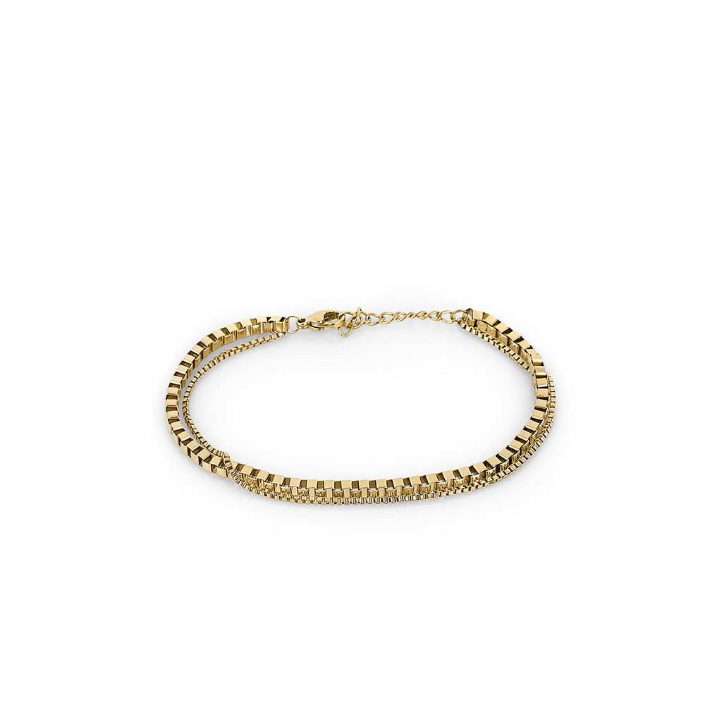 Bratara se remarca prin combinatia armonioasa de lanturi si elemente geometrice, oferind un aspect delicat, dar in acelasi timp impunator. Culoarea aurie confera un aer luxos, fiind usor de asortat atat cu tinutele casual, cat si cu cele elegante.