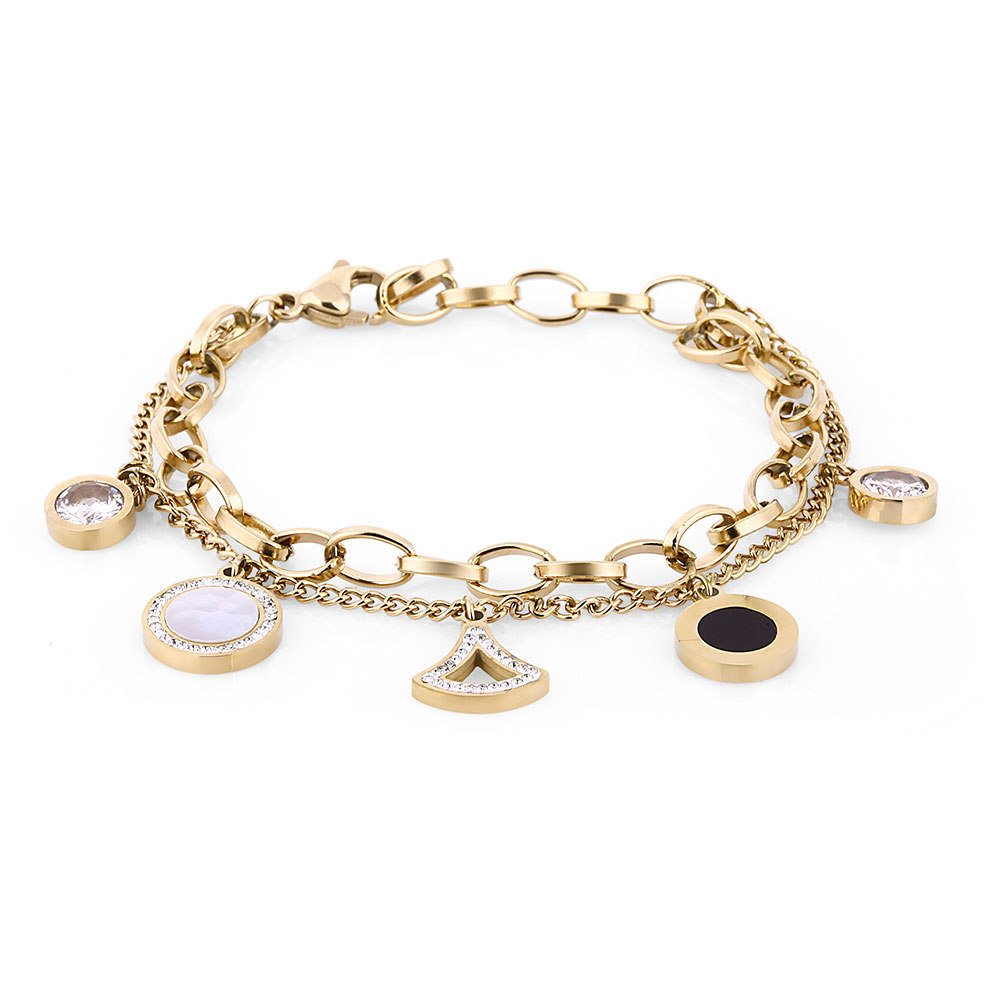 Designul sau modern este accentuat de un lant dublu, compus din zale mari si mici, oferind un aspect luxos si versatil. Decorata cu zirconii stralucitoare, aceasta bratara adauga un plus de rafinament oricarei tinute, fiind potrivita atat pentru evenimente speciale, cat si pentru purtarea zilnica.
