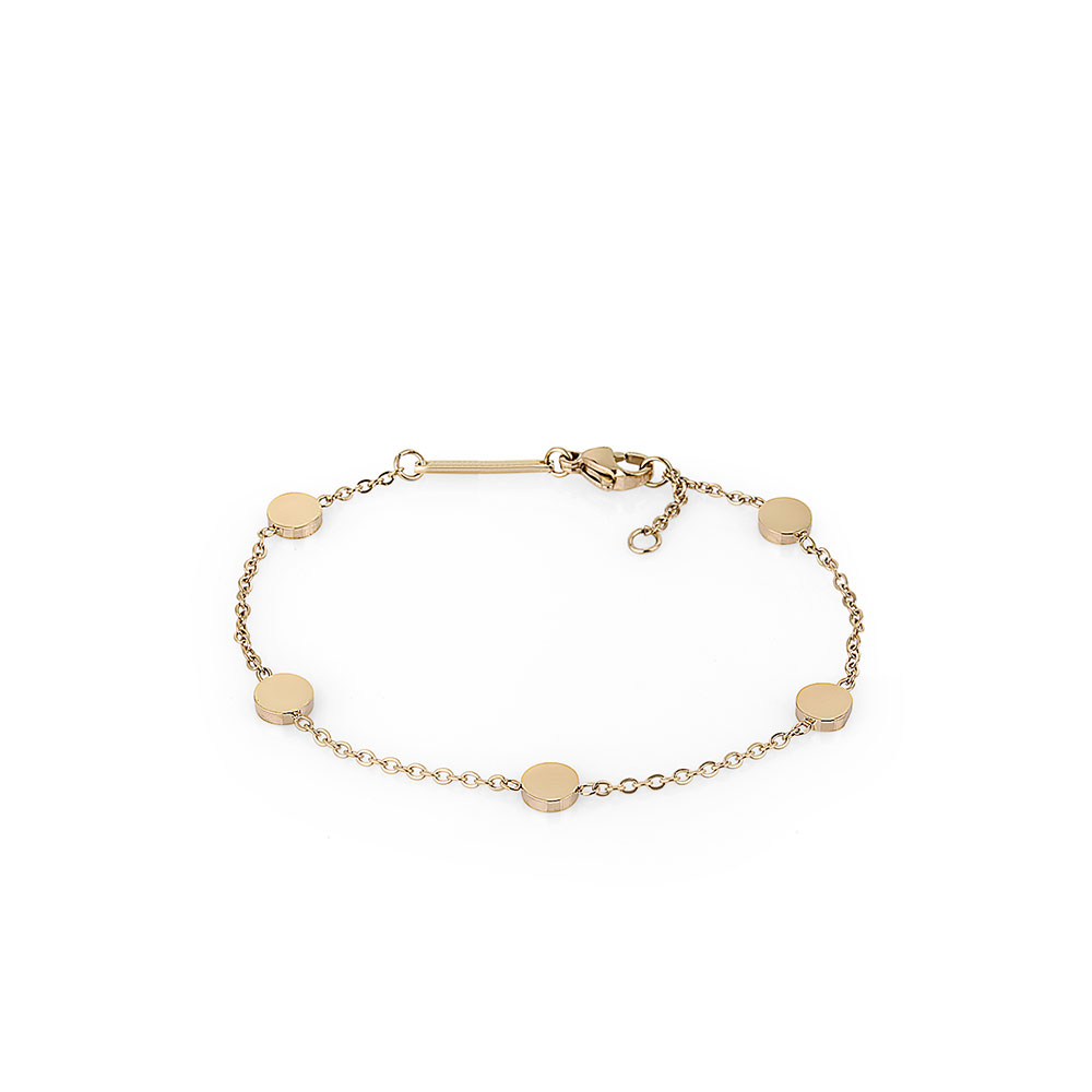 Bratara are o lungime de 180 mm si o latime fina de 1 mm, fiind usor de purtat atat in viata de zi cu zi, cat si la ocazii speciale. Designul sau minimalist este accentuat de elementele circulare discrete, distribuite armonios pe lantul fin, conferindu-i un aer modern si feminin.