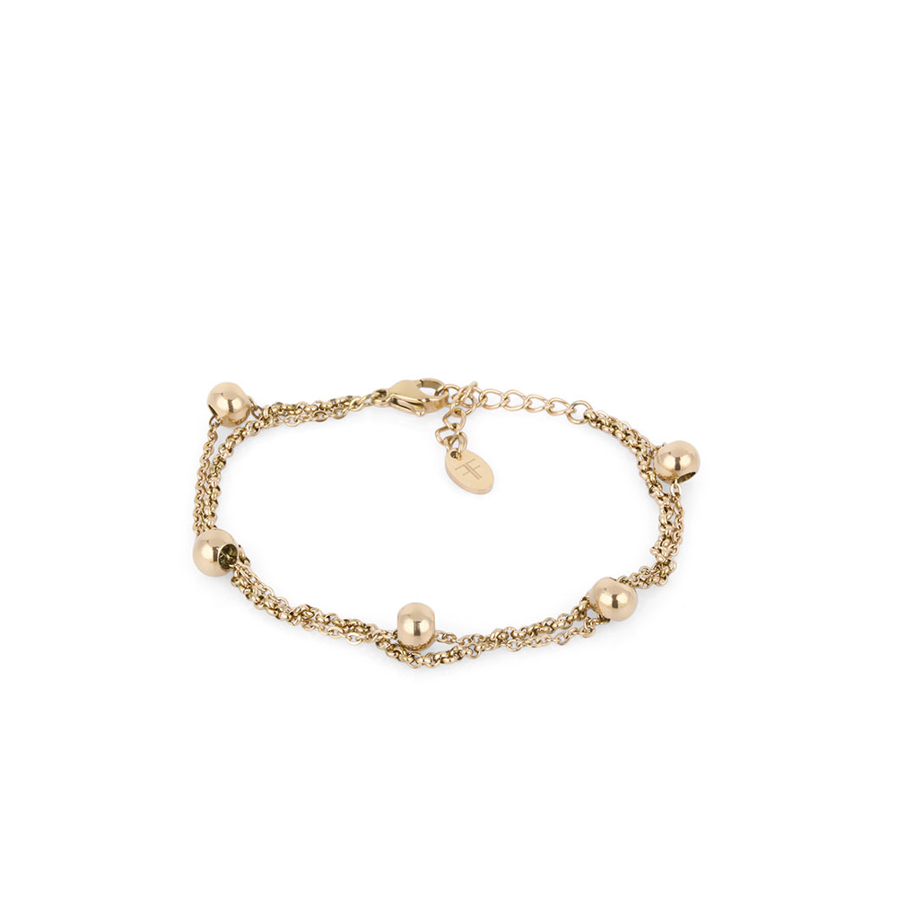 Designul bratarii este format din doua lantisoare fine, decorate cu margele metalice distribuite uniform, care adauga un plus de stralucire si textura. Sistemul de inchidere cu carlig asigura o fixare sigura si confortabila, permitandu-ti sa o porti intreaga zi fara griji.