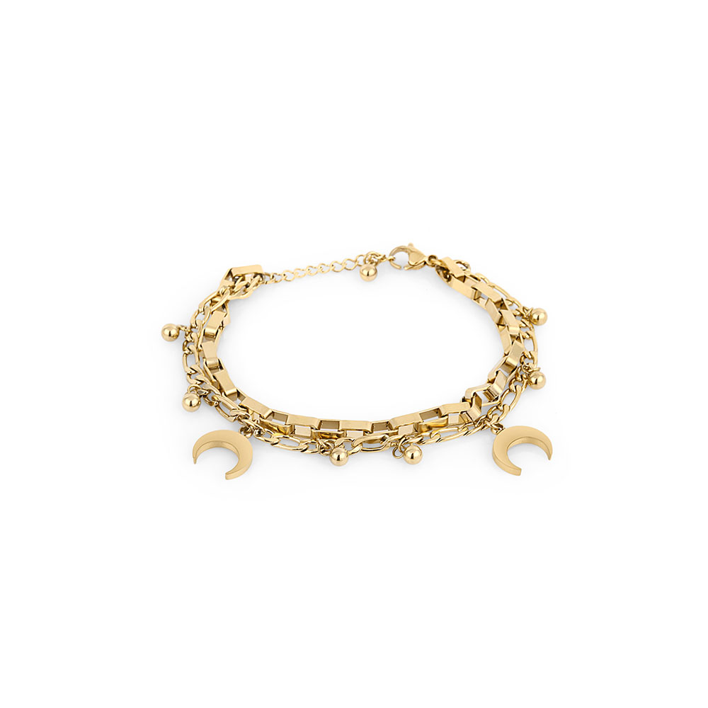 Modelul este compus din lanturi multiple, combinate armonios pentru a crea un efect vizual aparte. Accesorizata cu charm-uri delicate in forma de semiluna si mici sfere metalice, bratara adauga un plus de stil si originalitate oricarei tinute.