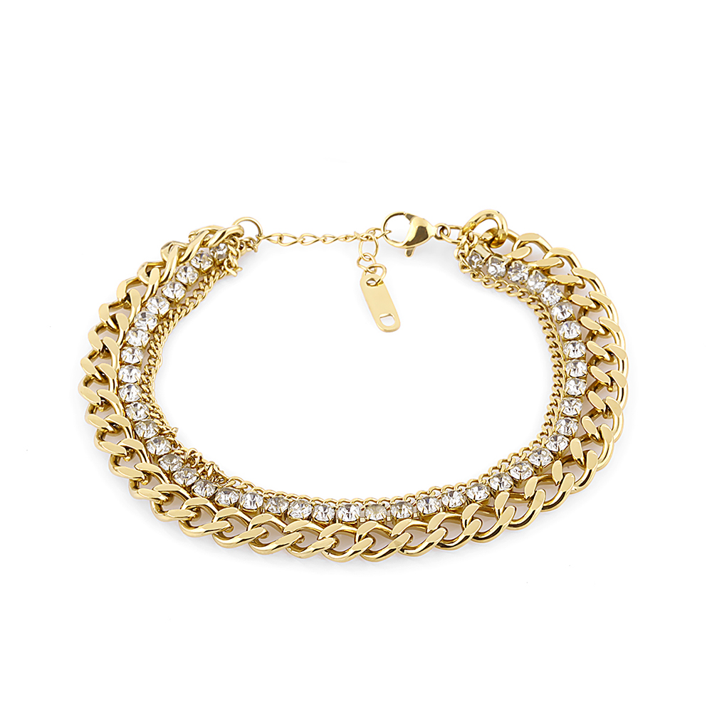 Realizata din otel inoxidabil, aceasta bratara se remarca prin durabilitatea sa si rezistenta la coroziune, pastrandu-si stralucirea de-a lungul timpului. Designul sau este alcatuit dintr-un lant dublu impletit, completat armonios de un sir de zirconii stralucitoare, care adauga un efect luxos si atragator.