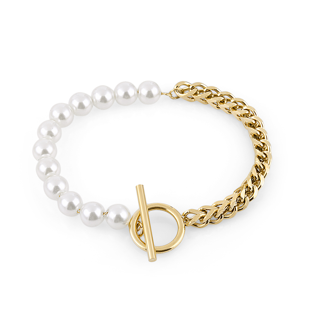 Designul sau unic imbina armonios doua stiluri: un lant auriu cu zale late si un sirag delicat de perle albe, oferind un contrast sofisticat. Decorata cu sidef, aceasta bratara capteaza lumina in mod subtil, accentuandu-i farmecul.