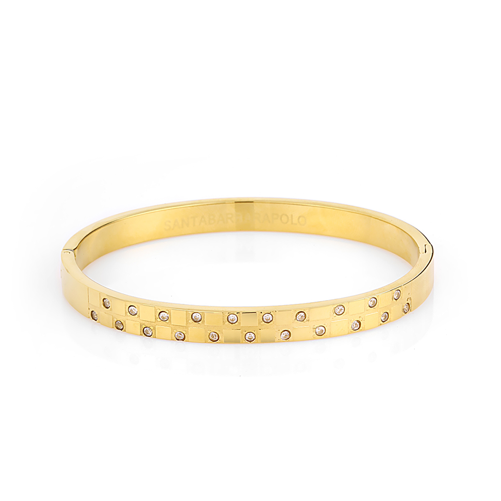 Completeaza-ti tinuta cu o bratara aurie eleganta de la Santa Barbara Polo, un accesoriu rafinat realizat din otel inoxidabil de inalta calitate. Aceasta bratara rigida impresioneaza prin designul sau modern si detaliile sofisticate, fiind alegerea perfecta pentru femeile care apreciaza accesoriile fine.