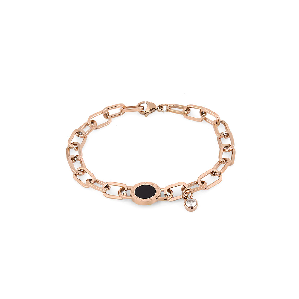 Bratara are o lungime de 170 mm si o latime de 6 mm, fiind confortabila la purtare si potrivita pentru diverse stiluri vestimentare. Elementul central al acestei piese este un detaliu oval cu finisaj negru, incadrat de cifre romane gravate, adaugand un aer sofisticat. In plus, un charm delicat decorat cu zirconii stralucitoare aduce un plus de eleganta si rafinament.