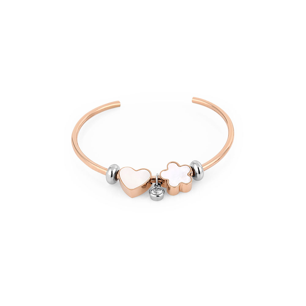 Designul modern al bratarii este accentuat de finisajul auriu rose, care adauga un plus de rafinament. Decorata cu sidef in forme delicate de inima si floare, aceasta bijuterie exprima feminitate si stil. In plus, margelele argintii si charm-ul cu cristal transparent adauga un detaliu stralucitor, perfect pentru un look sofisticat.