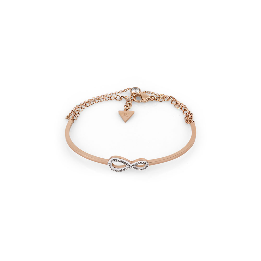 Elementul central al bratarii este simbolul infinitului, decorat cu zirconii stralucitoare, oferind un plus de rafinament si eleganta. Sistemul de inchidere cu carlig asigura o fixare sigura si confortabila, iar lantul suplimentar permite ajustarea dimensiunii pentru o potrivire perfecta.