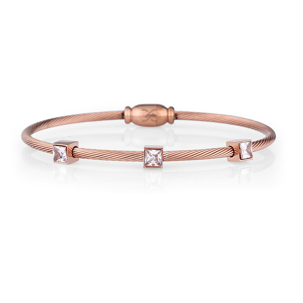 Designul sau modern este accentuat de cele trei zirconii stralucitoare, montate in casete patrate, care reflecta lumina intr-un mod spectaculos. Textura rasucita a bratarii ofera un aspect contemporan si versatil, potrivit atat pentru tinutele casual, cat si pentru cele elegante.