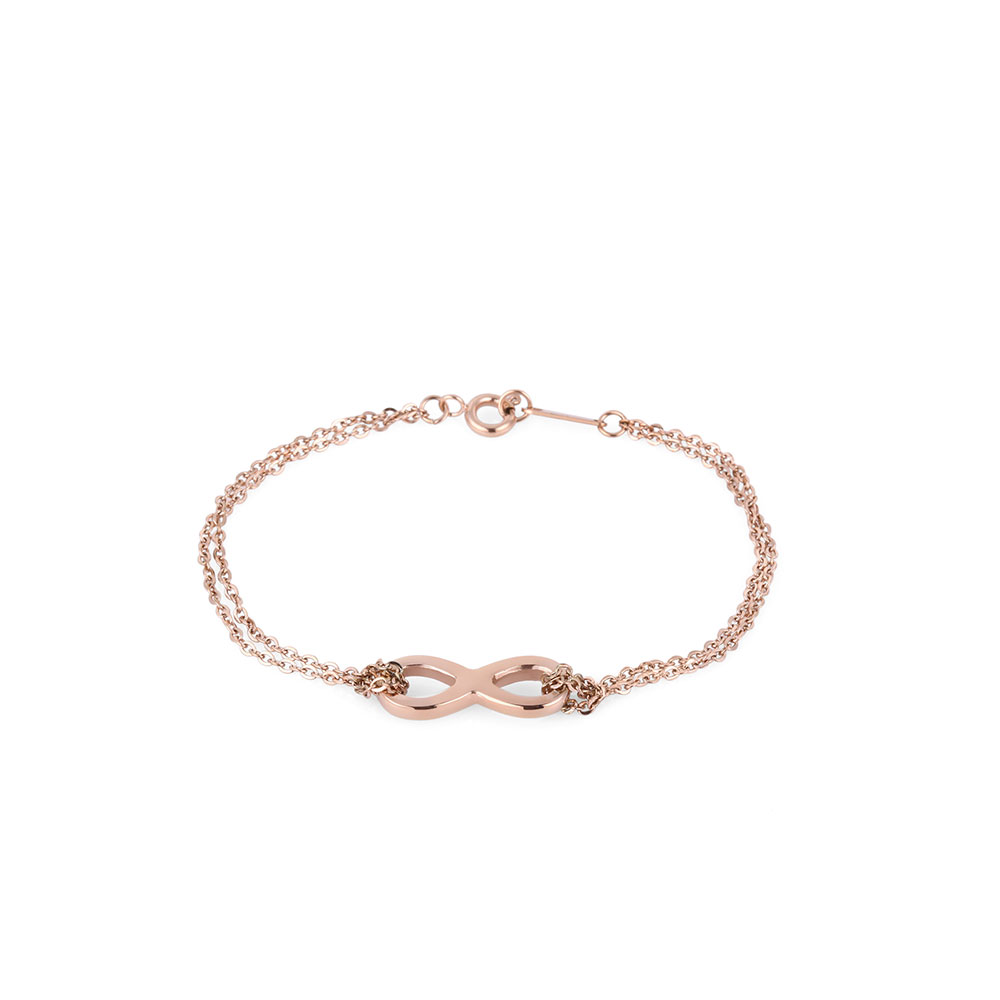 Designul sau modern include un simbol infinit central, un detaliu cu semnificatie puternica, simbolizand eternitatea si conexiunile de durata. Lantul fin dublu, cu o latime de doar 2 mm si o lungime de 180 mm, se aseaza elegant pe incheietura, oferind un aspect subtil si feminin.