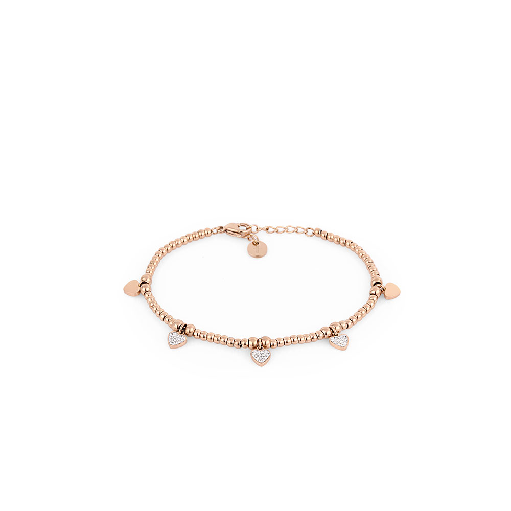 Bratara este decorata cu zirconii stralucitoare, oferind un efect vizual impresionant si un plus de rafinament. Designul sau delicat, compus din margele fine si pandantive in forma de inimioara, adauga o nota romantica si feminina oricarei tinute.