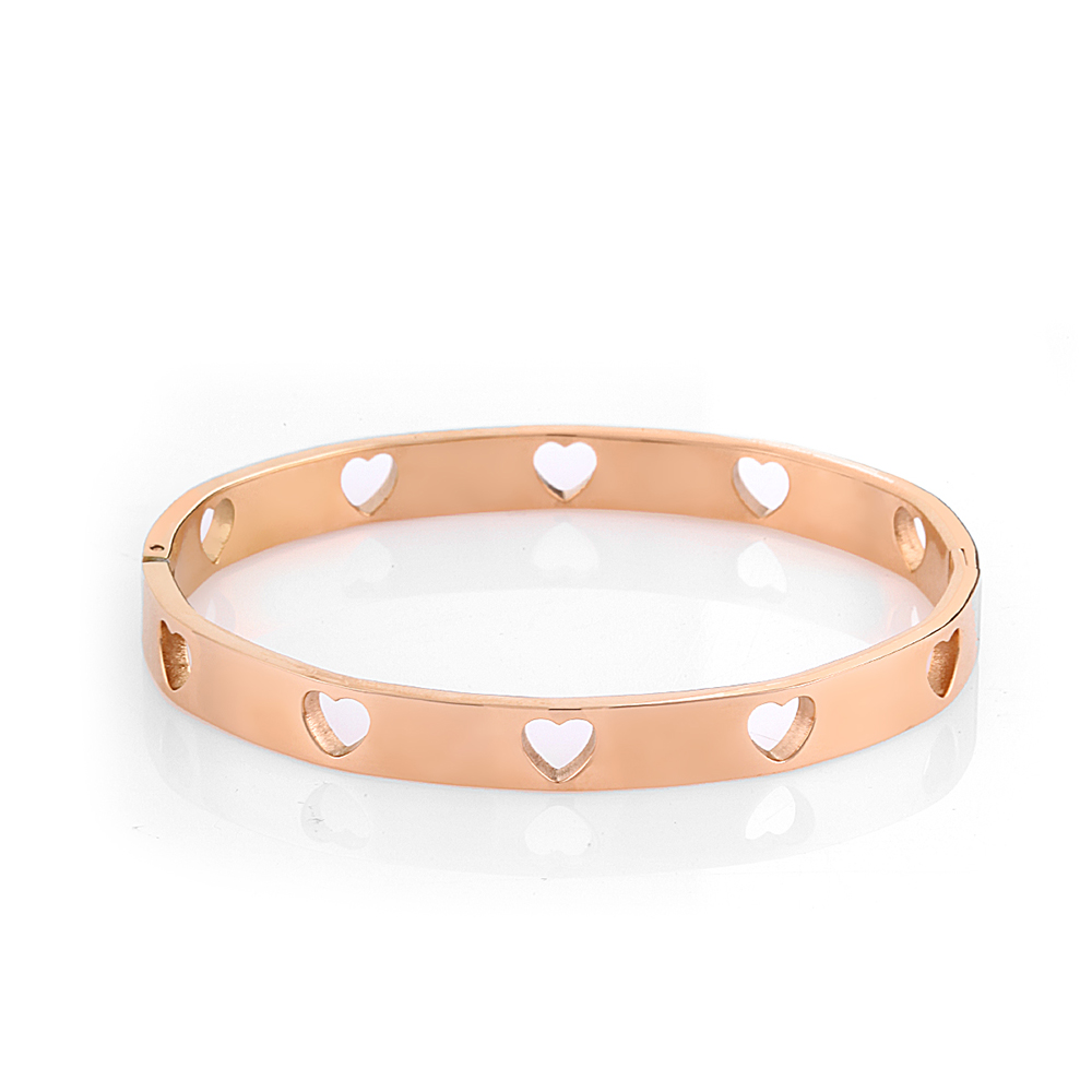 Designul distinctiv al bratarii este evidentiat de decupajele in forma de inima, care adauga un aer romantic si delicat. Cu o latime de 5 mm si o lungime de 165 mm, aceasta se potriveste perfect pe incheietura, oferind confort si o fixare sigura datorita sistemului de inchidere tip carlig.