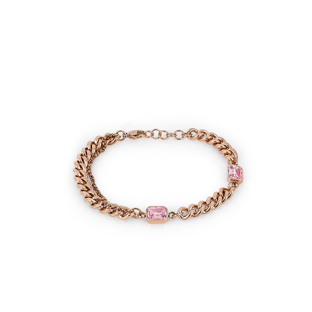 Designul bratarii este compus din doua lantisoare interconectate, oferind un aspect elegant si dinamic. Punctul central al acestei bijuterii este reprezentat de cele doua zirconii roz, atent slefuite pentru a reflecta lumina in mod spectaculos. Aceste detalii stralucitoare adauga un plus de feminitate si delicatete accesoriului.