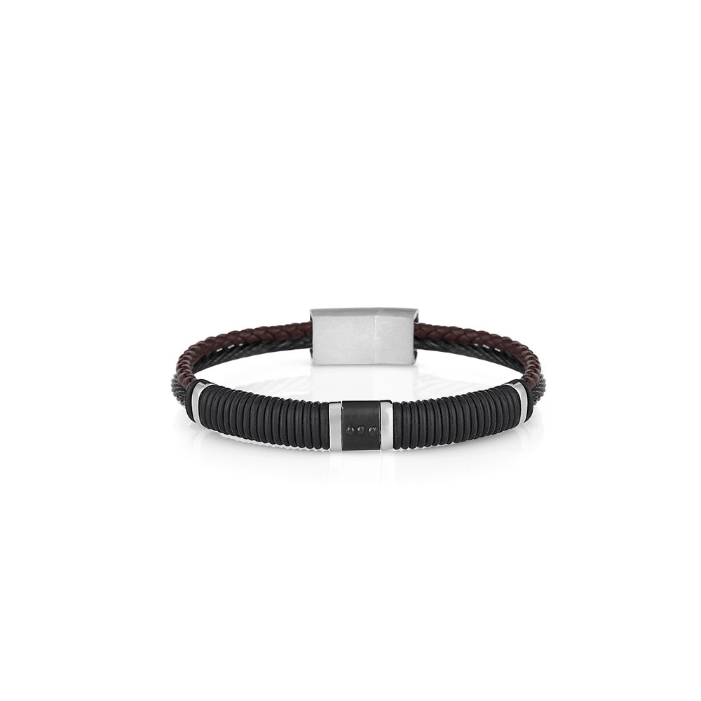 Bratara este alcatuita din doua sectiuni distincte: o banda impletita din piele maro si un segment cu detalii metalice si insertii negre, ce confera un aer sofisticat. Sistemul de inchidere magnetic asigura o fixare sigura si confortabila, permitandu-ti sa o porti cu usurinta pe parcursul intregii zile.