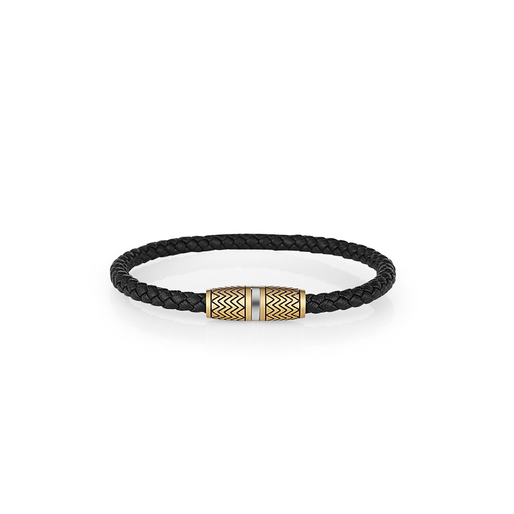 Bratara este confectionata din piele naturala neagra, impletita cu grija pentru un aspect sofisticat si modern. Elementul central este realizat din otel inoxidabil, avand un design bicolor in nuante de auriu si argintiu, decorat cu motive geometrice ce adauga un plus de originalitate.