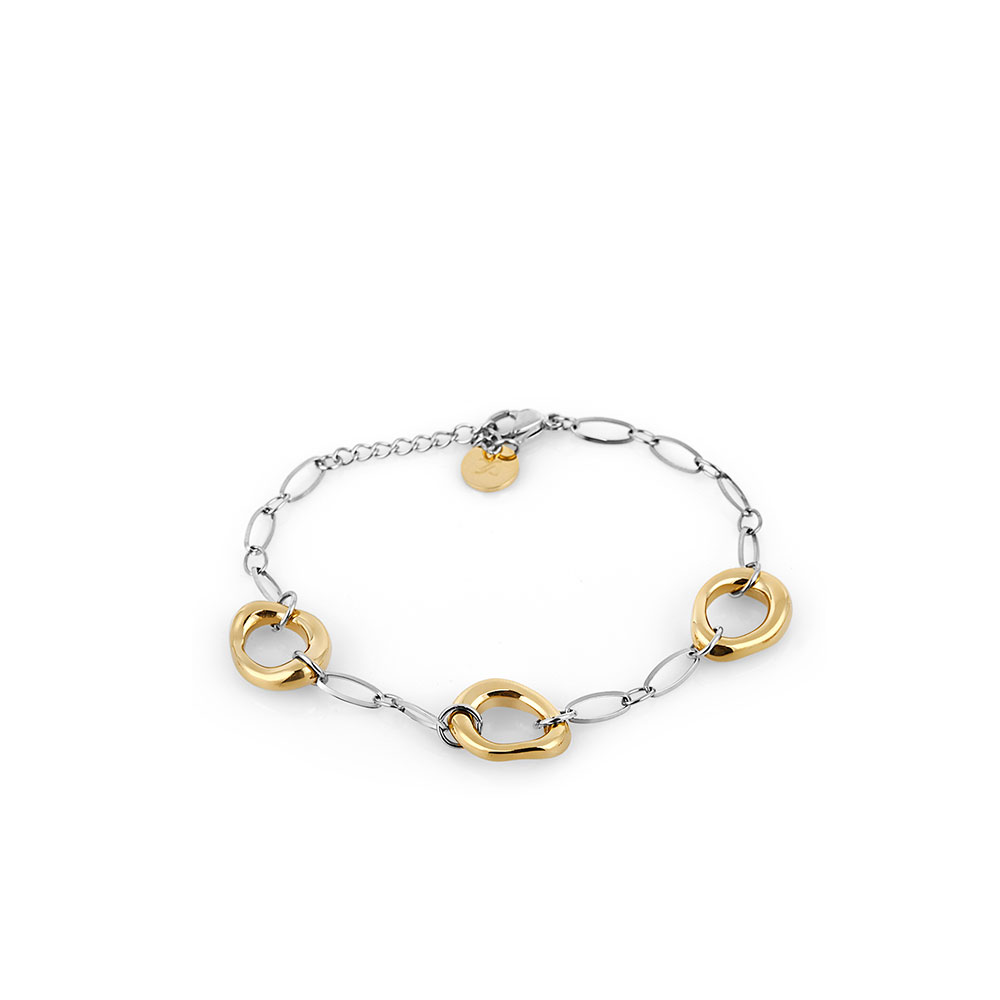 Designul bratarii este compus din zale subtiri argintii, intercalate cu elemente decorative aurii in forma de cercuri neregulate, conferind un aspect unic si atragator. Sistemul de inchidere tip carlig asigura o fixare sigura si confortabila, permitand ajustarea usoara pe incheietura.