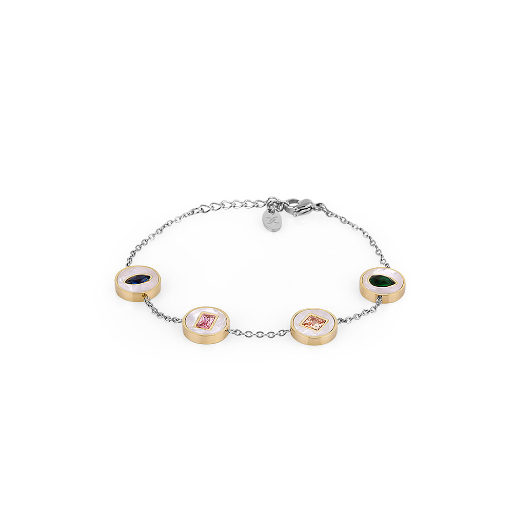 Modelul este alcatuit dintr-un lant fin, argintiu, decorat cu patru elemente circulare aurii, fiecare avand in centru cate un cristal stralucitor in nuante de roz, portocaliu, verde si albastru. Aceasta combinatie cromatica adauga un plus de farmec si versatilitate, facand bratara potrivita atat pentru tinutele casual, cat si pentru cele elegante.