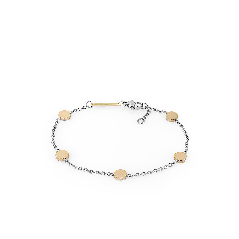 Designul sau bicolor imbina armonios tonurile de argintiu si auriu, oferind un aspect modern si versatil. Lantul fin este decorat cu elemente circulare aurii, care adauga un plus de eleganta si feminitate.