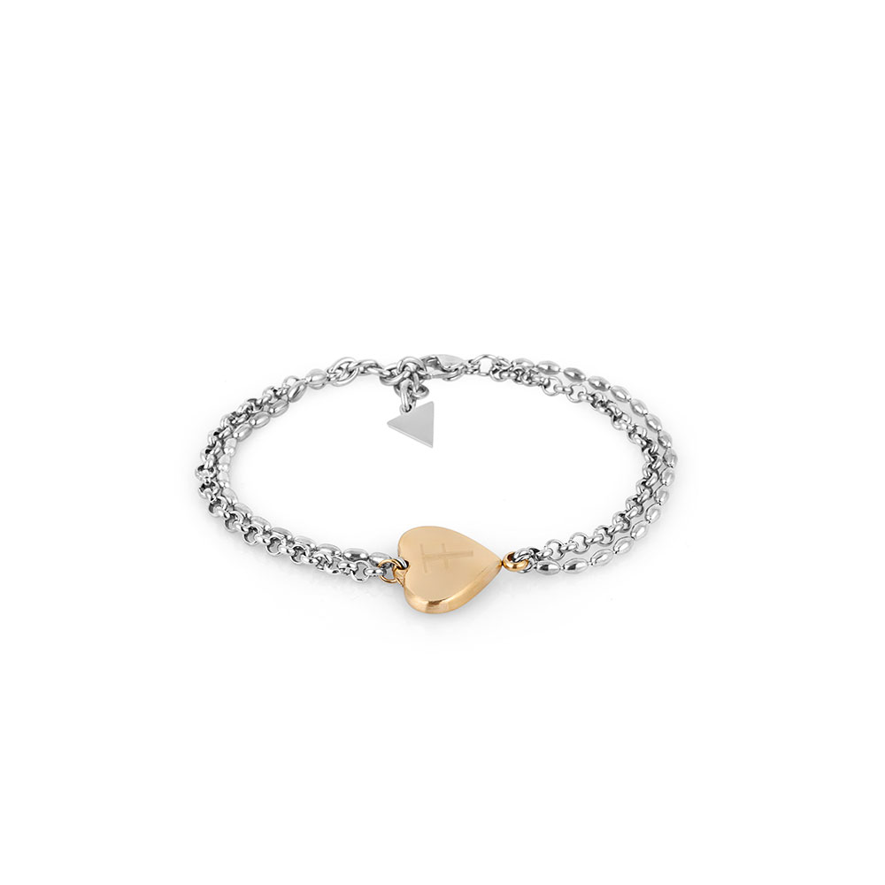 Bratara este compusa dintr-un lant dublu argintiu si un pandantiv in forma de inima aurie, oferind un contrast armonios intre cele doua nuante. Acest detaliu delicat subliniaza feminitatea si adauga un aer romantic accesoriului.