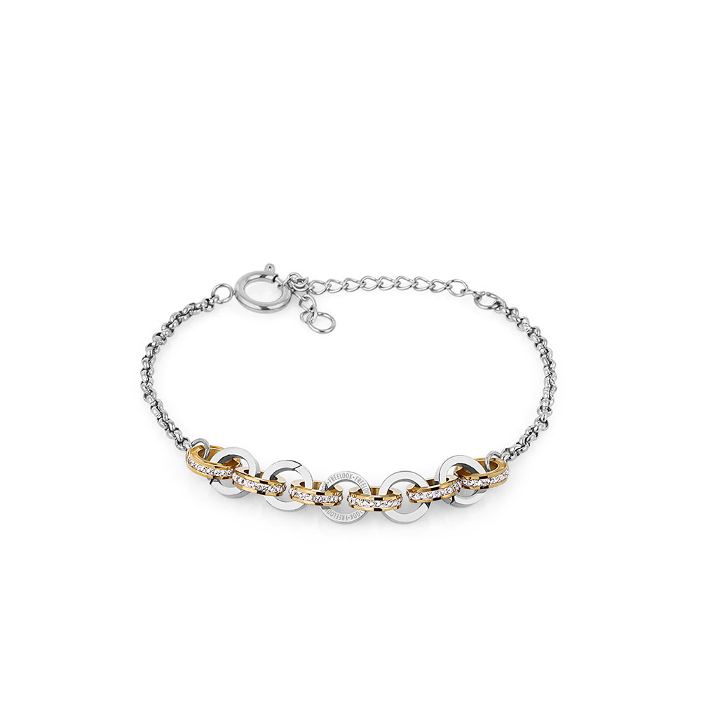 Designul bratarii se remarca printr-o succesiune de inele argintii, legate printr-un lant delicat auriu, incrustat cu cristale stralucitoare. Aceasta combinatie ofera un aspect sofisticat si modern, fiind o alegere ideala pentru orice ocazie.
