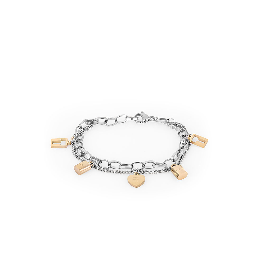 Designul sau rafinat imbina armonios tonurile de argintiu si auriu, oferind un aspect versatil si elegant. Bratara este decorata cu charm-uri aurii in diverse forme, inclusiv inimi si lacate, simbolizand eleganta si feminitatea.